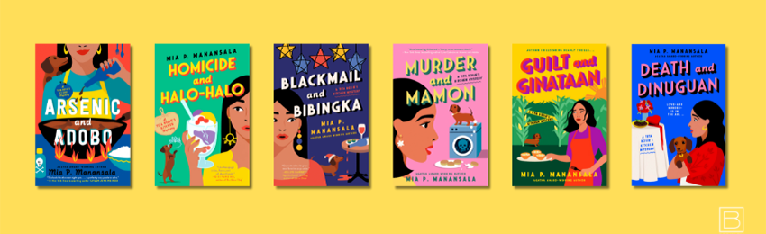 These six books comprise the Tita Rosie’s Kitchen Mystery Series written by Mia P. Manansala. (Book covers designed by Vi-An Nguyen, graphic courtesy of Berkley/Penguin Random House)