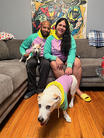 Mia’s cheering squad, her husband James Stennis and their dogs Max Power and Gumiho. (Photo courtesy of Mia P. Manansala)