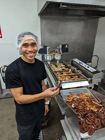 Kristoffer Quiaoit at the donut factory experimenting to find the recipe that works. It took years to get the recipe right.