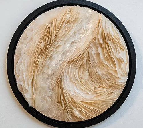 Her Capiz Wave series experiments with the shells to create rippling forms resembling waves and surprisingly, soft fluffy feathers. In Turbulence, Rowena visualizes opposing forces: two cultures tugging at each other, or the tension between family expectations and personal truth. She thinks of the ocean as a single body whose waves push and pull unpredictably, much like life, where things do not always fit neatly together.