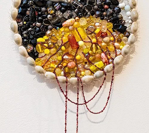 In her Balut series, Rowena confronts eating balut, the fertilized duck embryo, a traditional Filipino snack that is popular, but also invites controversy. She playfully recreates the balut using yellow, white, and black beads, making it palatable for the uninitiated. Her titles–Transfer of Power, The Beginning and the End All in One Bite, Life Interrupted, and This Isn’t How I Thought It Would Be –address the unsettling act of eating a whole duck embryo.