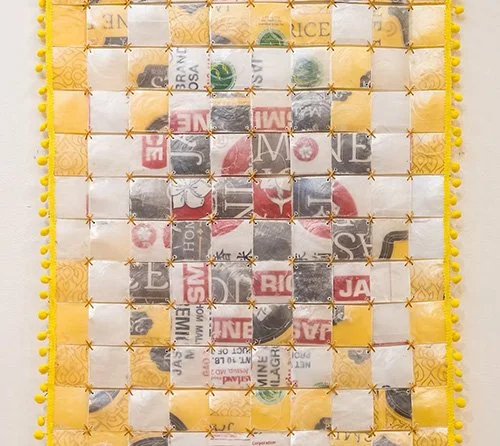 Rowena describes her work as “Filipina Futurism,” “creating a new visual and cultural language—one that speaks to the experiences of being neither fully from one land nor the other and forges a path that bridges histories and redefines tradition.” This sentiment shows in her work which is deeply personal but also emblematic of generations of Filipino Americans who grew up in the United States. Her capiz quilts juxtapose her own stories with shared Filipino and immigrant narratives. A recent American University Museum exhibit underscores a similar sensibility, featuring Filipino American multimedia artists like Mic Diño Boekelmann, known for her use of Manila envelopes, and Jeanne F. Jalandoni, who incorporates fabric into her paintings.