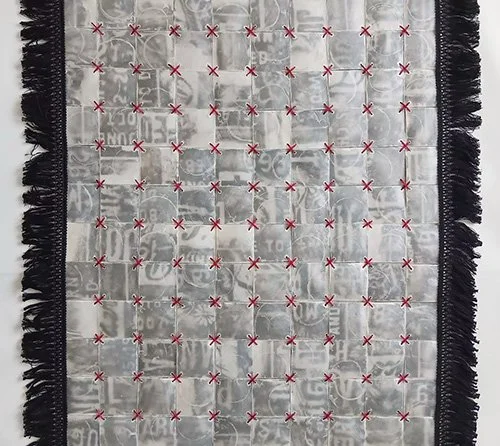 The most personal of Rowena’s works is the Anitos Quilt, a love letter to her children Melanie, Molly, and Jasmine. Measuring 22 by 29 inches, it is formed from curved capiz shells stitched front and back into a puffy quilt, with piña cloth inside for support. Embedded within are grave rubbings she made of her grandparents’ headstones when she visited the Philippines in 2023, arranged in multiple directions to keep the inscriptions intimate and somewhat unreadable. The quilt serves as a symbolic security blanket for her children, representing the protection from the spirit of ancestors long gone.
